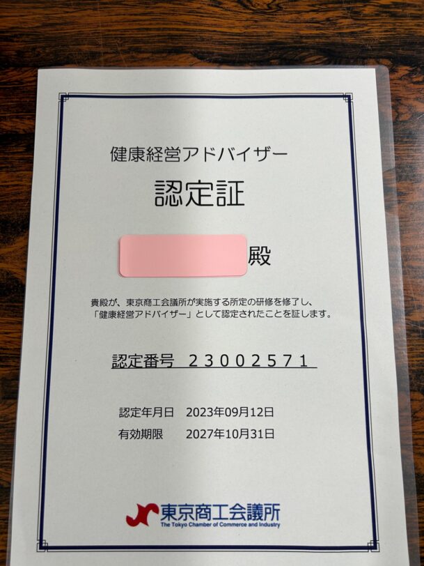 健康経営の取組み「健康経営アドバイザー認定」を更新しました。