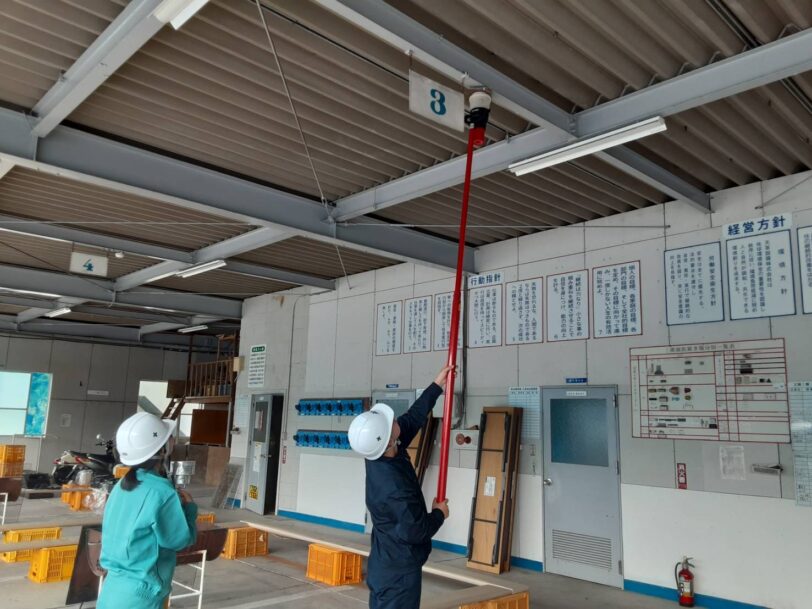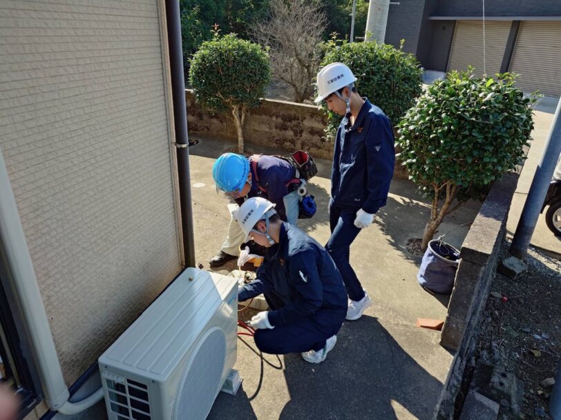 実習内容は、安全に関する座学から始まり、工事現場の見学、一般住宅やアパートの電気工事(照明器具取付、エアコン取替など)や消防点検を各担当者に同行して、実習を行いました。